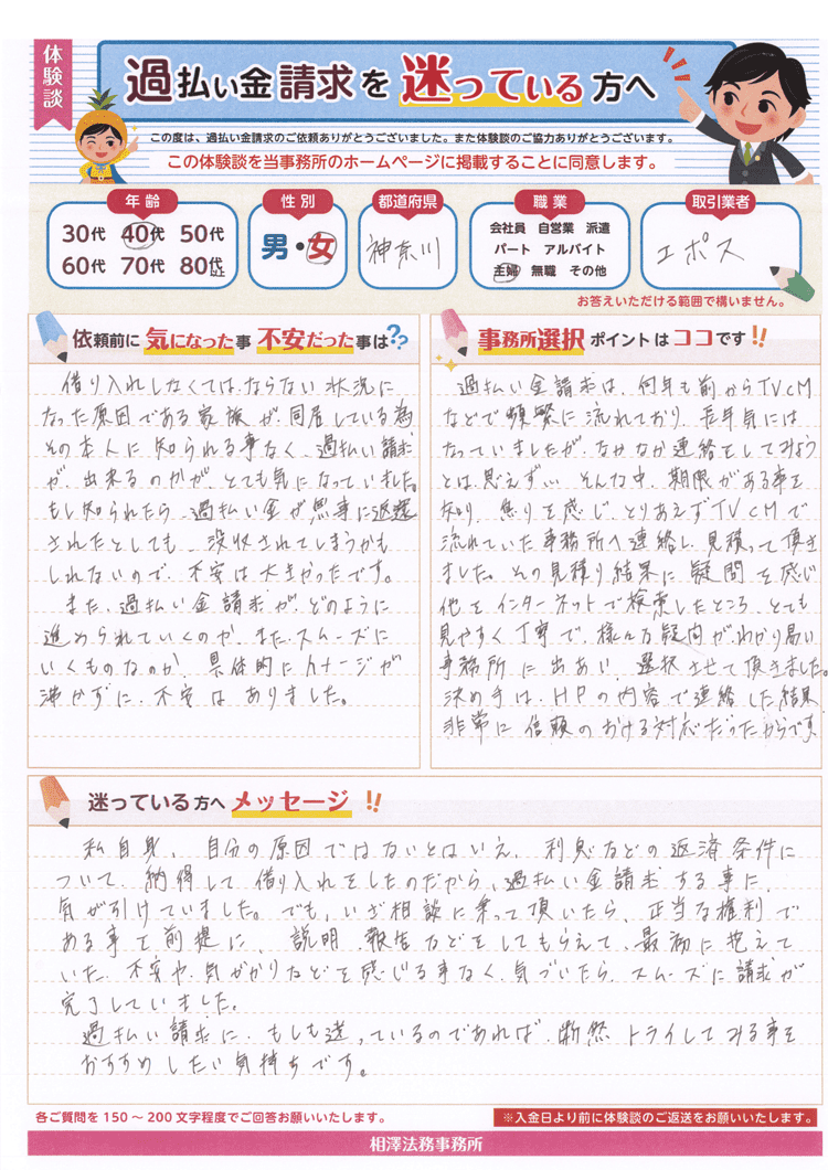過払い金請求は、何年も前からTVCMなどで頻繁に流れており、長年気にはなっていましたが、なかなか連絡をしてみようとは思えず…そんな中、期限がある事を知り、焦りを感じ、とりあえずTVCMで流れていた事務所へ連絡し、見積って頂きました。