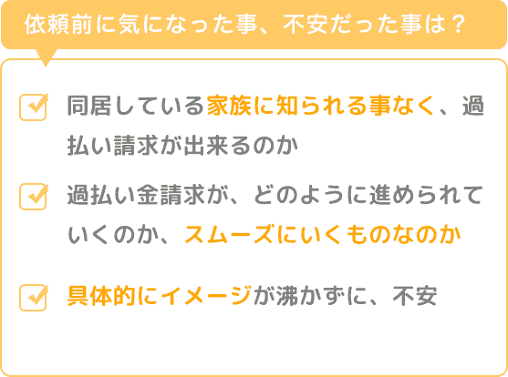 もし知られたら、過払い金が無事に返還されたとしても、没収されてしまうかもしれないので、不安は大きかったです。また、過払い金請求が、どのように進められていくのか、また、スムーズにいくものなのか、具体的にイメージが沸かずに、不安はありました。