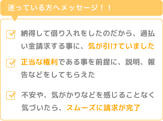 でも、いざ相談に乗って頂いたら、正当な権利である事を前提に、説明、報告などをしてもらえて、最初に抱えていた、不安や、気がかりなどを感じることなく、気づいたら、スムーズに請求が完了していました。