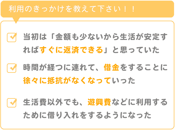私が最初に利用するきっかけとなったのは生活費への補填として少額利用を目的とした利用でした。