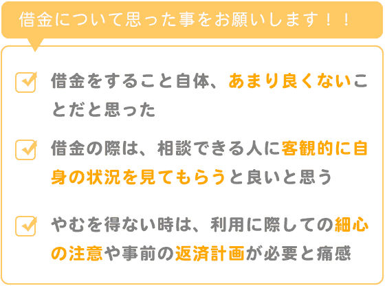 やむを得ずに借金をしないといけない状況もあるかと思いますが、返済方法や返済までの期間など利用するに際して細心の注意や事前の返済の計画性を持つことが必要だと強く痛感しました。