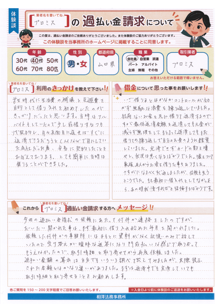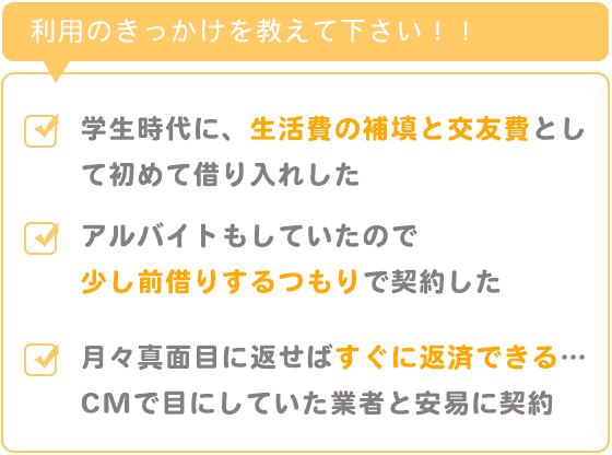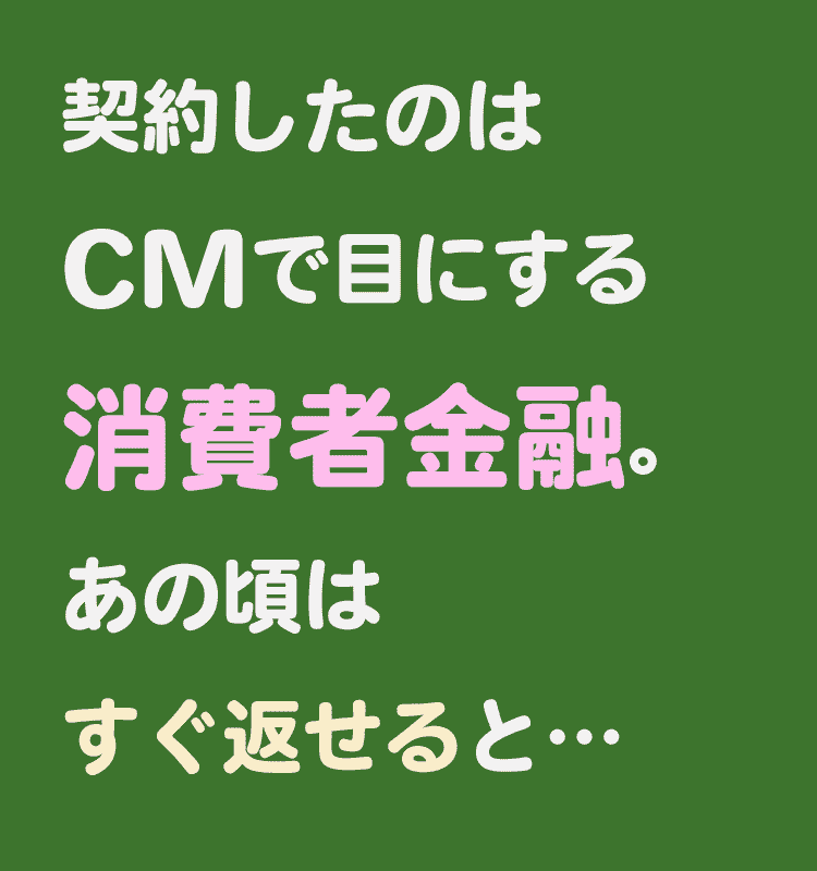 当時はアルバイトもしていたので少し前借りするつもりで契約し、月々真面目に返せばすぐに返済できるだろうとCMなどで目にしていた会社だった為、安易に契約したことをおぼえております。