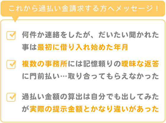依頼した何件かの事務所には手もとに資料がなく記憶のみで話していたので受け答えが曖昧な返答になり門前払いな感じで取り合ってもらえなかったので、取引明細を取り寄せてから再度依頼しました。