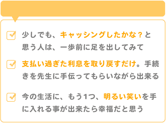 自分自身が支払い過ぎた利息を取り戻すだけですから。お金もそうですが、自分の気持が、前向きに明るくなると思いますよ!!当然の手続きを、先生方に手伝っていただきながら済ませる事が出来るんですから!!