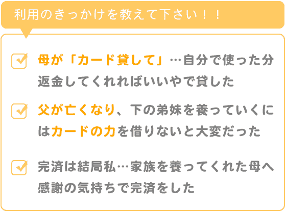 第三者への貸し出しは本当は良くないのも知っていましたが父が亡くなり私は成人して間もなく、下の弟妹を養っていくにはカードの力を借りないと大変だったという感じです。