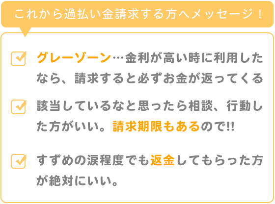 グレーゾーン…金利が高い時の利用をしたのならば請求すると必ずお金が返ってきます。