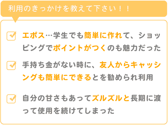 その後、手持ちのお金がないときに友人からキャッシングも簡単にできることを勧められて、使ってしまった結果自分の甘さもあってズルズルと長期に渡って使用を続けてしまいました。