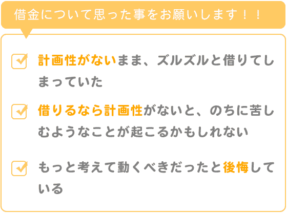 借りないことが一番いいのでしょうが、借りるなら計画性がないと、のちに苦しむようなことが起こるかもしれないので、もっと考えて動くべきだったと後悔しています。