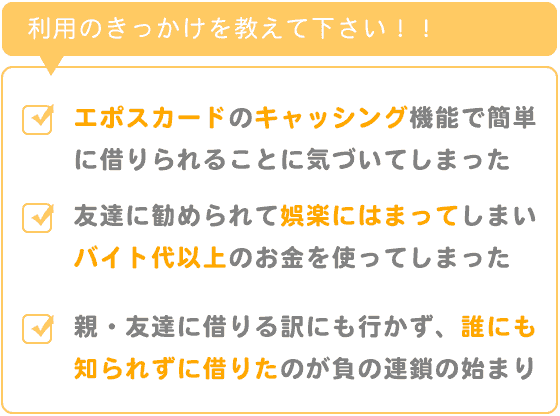 友達に勧められて娯楽にはまってしまい、バイト代以上のお金を使ってしまいそれでも遊びたくて、しかし親・友達に借りるわけにも行かず、黙ってだれにも知られずに借りることになったのが負の連鎖の始まりでした。