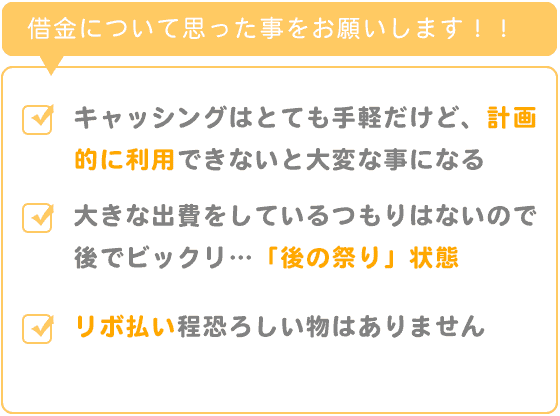 キャッシングはとても手軽で、回数や期間を自分で決められるのは良いが、結果としてリボ払いのようになってしまったり、計画的に利用できないと大変な事になると思う。
