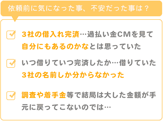 私は以前、3社から借り入れがありすでに完済はしていましたが毎日の様にテレビで過払い金のCMを見ていて自分にももしかしてあるのかなとは思っていたがいつから借りていていつ完済したかなどほとんど覚えていなくて借りていた3社の名前しかわかりませんでした。