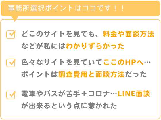 私は日頃から電車やバスに乗るのが苦手でそれにプラスしてコロナの時期なのでよけいにLINE面談が出来るという点に惹かれてこちらの事務所を選択させて頂きました。