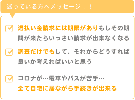 それでも本当に大丈夫なのかとか調査や着手で相当なお金がかかって結局は大した金額が手元に戻ってこないのではないか、何度も事務所に行ったりあれこれ言われるのではないかと勝手に思い込んでいました。