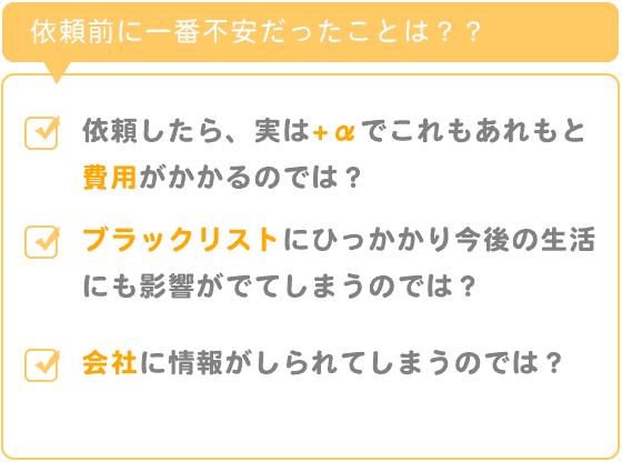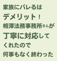 特に働いている会社に情報がしられてしまうのではないか、ということも今後の生活への影響という中では不安で依頼にふみだせませんでした。