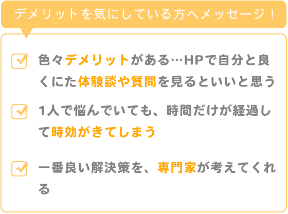色々なデメリットがあると思うのですが、きちんとホームページに記載されているのでまずは自分と良くにている体験談や、質問を見るといいと思います。