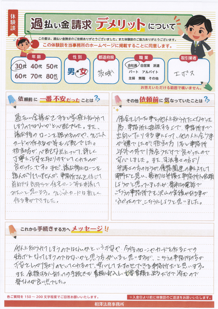 借金をしていた事を他人に知られたくなかった為、事務所に相談する上で、事務所まで出向いたりする事によって、他の人に会う事が嫌でしたが、担当の方の1名と事務所以外の外で1度会うだけで良かったので安心しました。