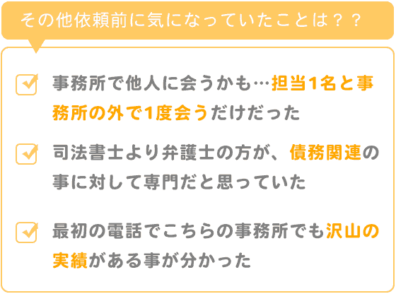 また、司法書士の方より弁護士の方の方が、債務関連の事に対して専門だと思い、最初は弁護士事務所に依頼しようかと思っていましたが、最初の電話でこちらの事務所でも沢山の実績がある事が分かったので、こちらにしようと思いました。