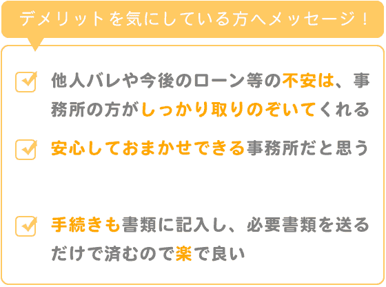 他人に知られてしまうのではないかという不安や、今後のローンやカードを作る上での妨げになってしまうのではないかと思う方がいると思いますが、こちらの事務所の方が不安をしっかり取りのぞいてくれるので、安心しておまかせできる事務所だと思います。