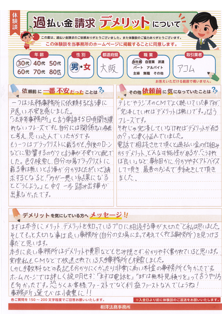 電話で相談させて頂くと過払い金の仕組みからデメリット、どんな可能性があるか、「こうすれば良い」など、事細かに、分かりやすくアドバイスして頂き、最善の方法で手続きして頂きました。