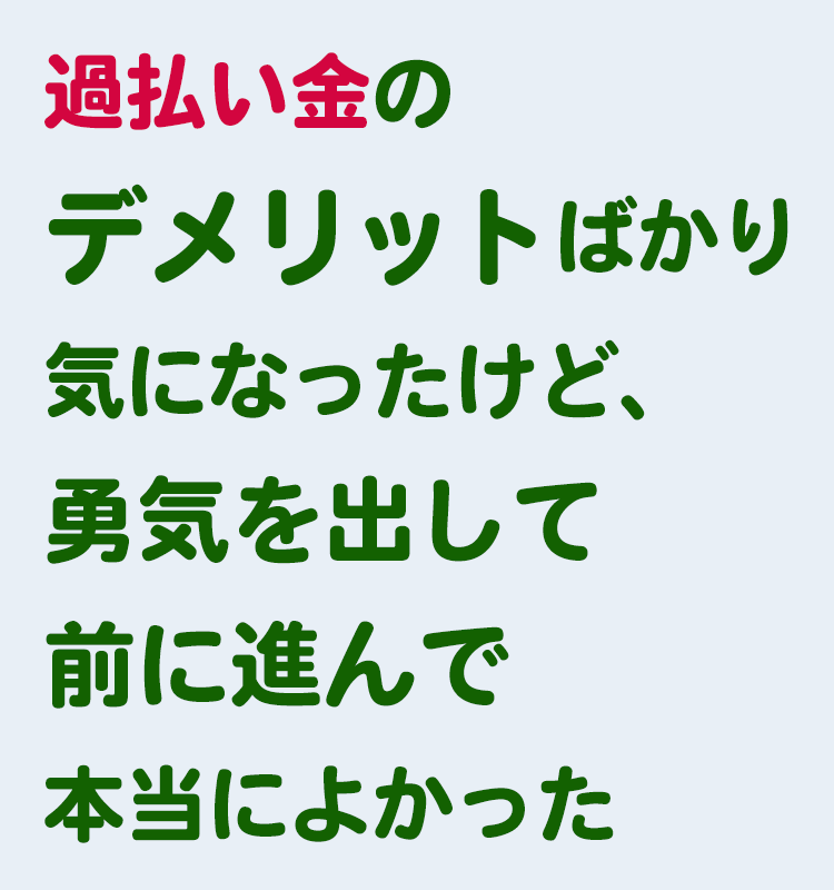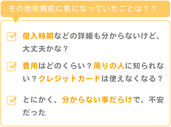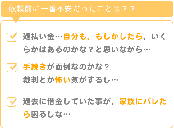 過払い金の有無の他に、借入をしていた時期などの詳細も分からないけど、大丈夫かな?もし依頼する事になったら、費用は、どのくらいかかるのかな?裁判などの状況になった場合、周りの人に知られてしまったり、今の生活に支障が出たりしないかな?クレジットカードが使えなくなったりしないのかな?とにかく、分からない事だらけで、不安でした。