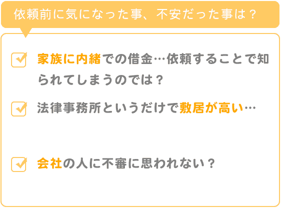 家族に内緒での借金だったので依頼することで知られてしまうのではないかと不安でした。
