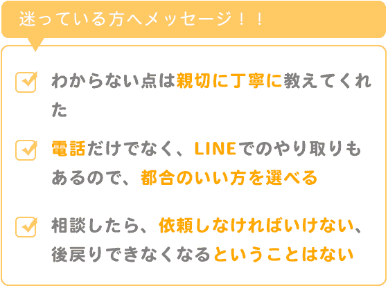 又、お電話をいただいた時の気配りや、丁寧さも印象がよかったのでその点もお願いしようと思った点です。