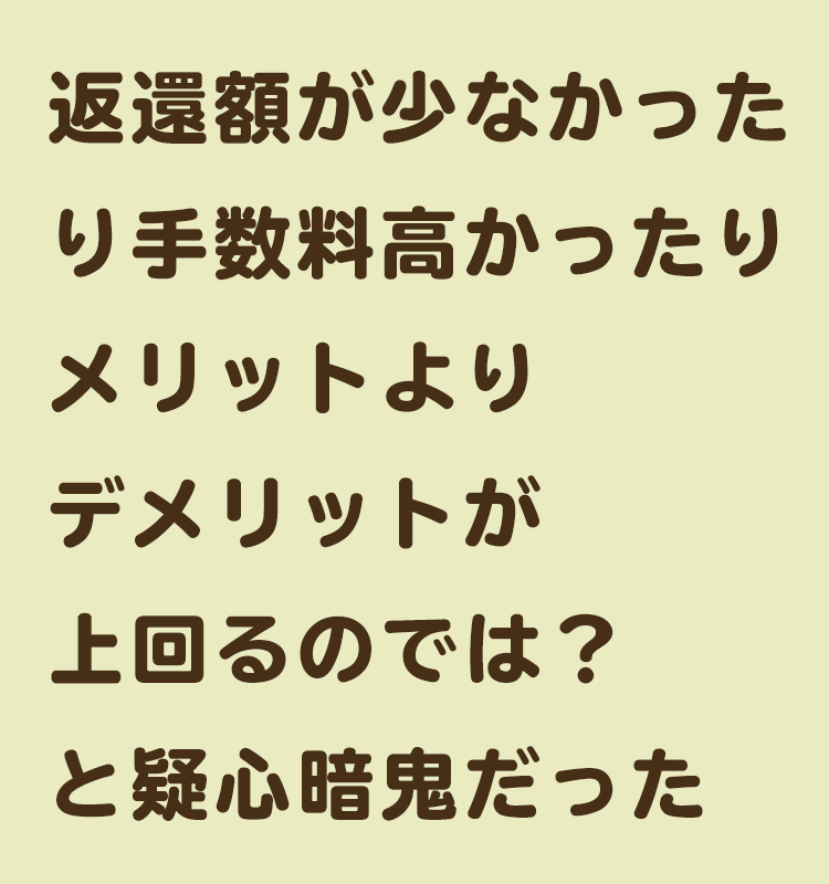 きっと手続きも煩雑で相談したとしても調査の結果「過払金はありません」とか言われてしまうのでは、過払い金が発生したしても返還額が少なかったり手数料が高額でメリットよりデメリットの方が多いのではと思当初連絡出来ずにいた。
