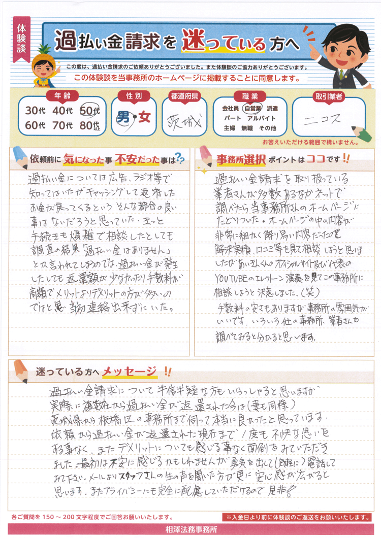 過払い金請求について半信半疑な方もいらっしゃると思いますが実際に複数社から過払い金が返還された今は(妻も同様)茨城県から板橋区の事務所まで伺って本当に良かったと思っています。