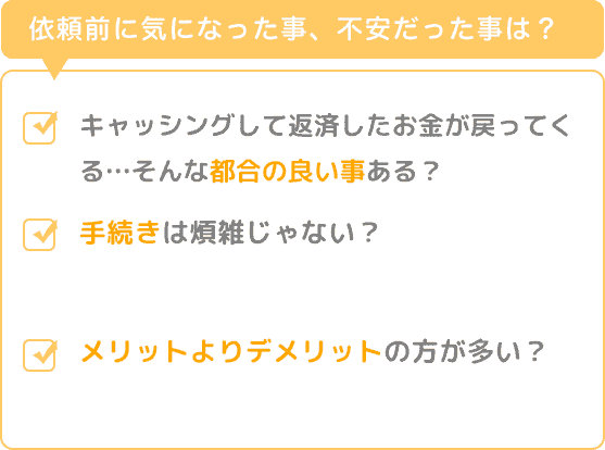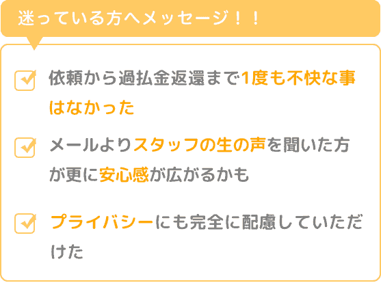 依頼から過払金が返還された現在まで1度も不快な思いをする事なく、またデメリットについても感じる事なく面倒をみていただきました。