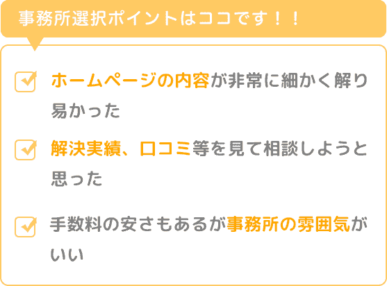 ホームページの中の内容が非常に細かく解り易い内容だったのと解決実績、口コミ等を見て相談しようと思いましたがあいきんくんのオフィシャルサイトおよび代表のYouTubeのエレクトーン演奏を見てこの事務所に相談しようと決意しました(笑)