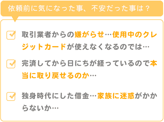 独身時代にした借金でしたので家庭をもった今、家族に迷惑がかからないかという不安もありました。