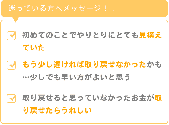もう少し依頼が遅ければ取り戻せなかったかもしれないので少しでも早く依頼する方がよいと思います。