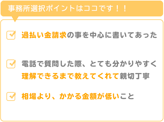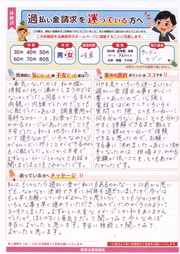 HPを見ていろいろ迷いましたが過払い金請求の事を中心に書いてあったので、心強く電話をはじめてしていろいろと質問した際、とてもていねいに何も分からない私にとても分かりやすく理解できるまで教えて下さり親切ていねいで信頼できると思ったので、お願いする事に決めました。