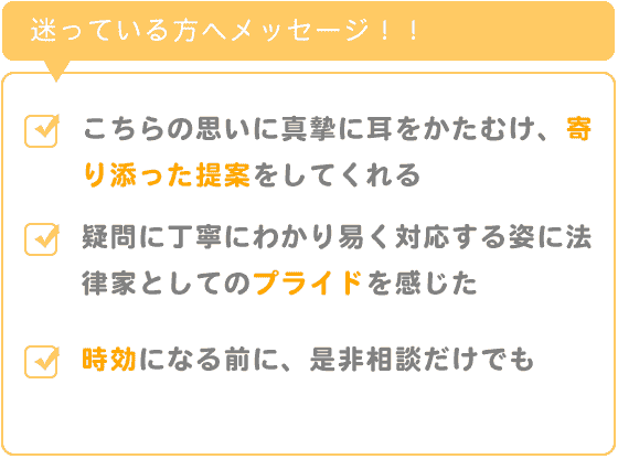 時効になる前に、是非相談だけでもされることをおすすめいたします。
