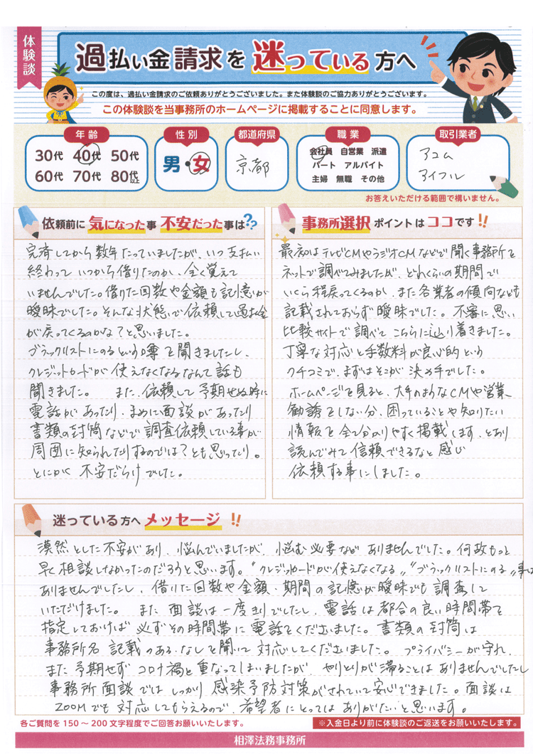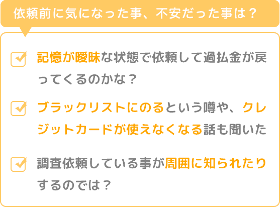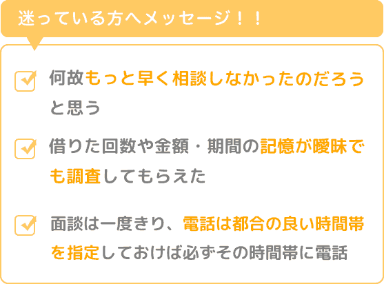 何故もっと早く相談しなかったのだろうと思います。“クレジットカードが使えなくなる”“ブラックリストにのる”事はありませんでしたし、借りた回数や金額・期間の記憶が曖昧でも調査していただけました。