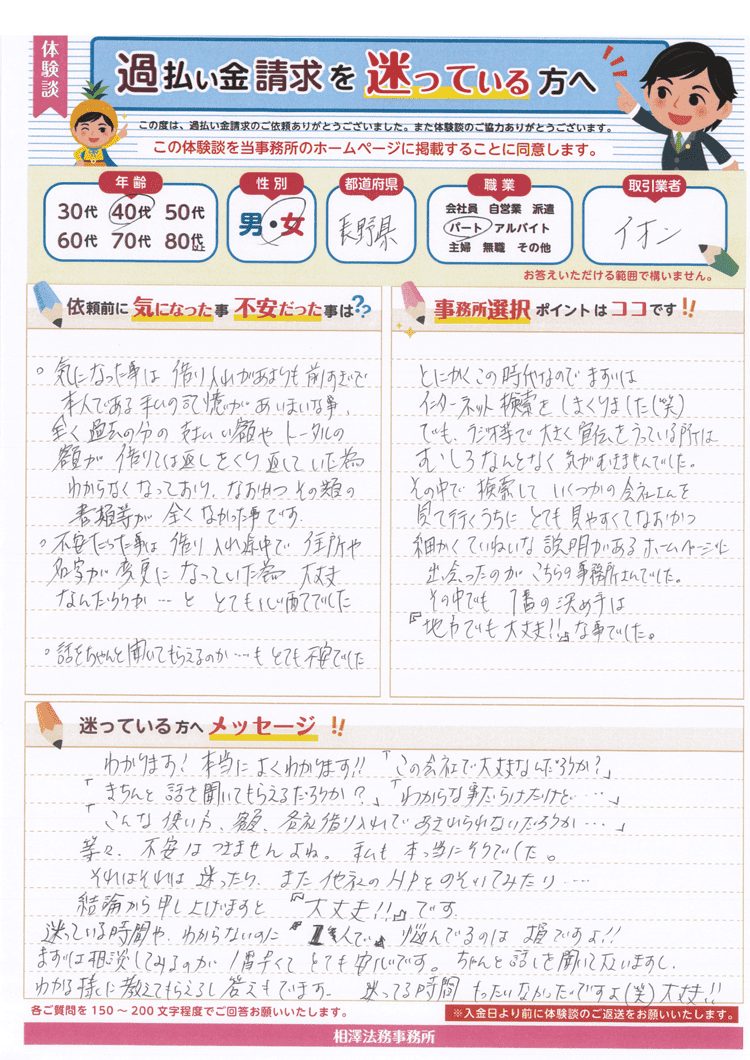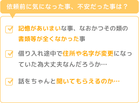 ・不安だった事は借り入れ途中で住所や名字が変更になっていた為大丈夫なんだろうか…ととても心配でした