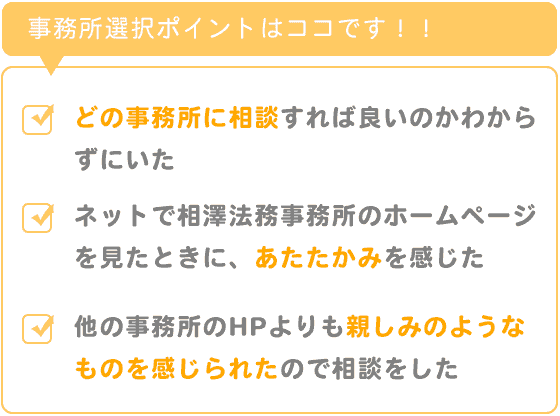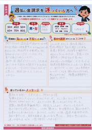 TVCMやチラシで過払金請求に関する情報やそれに対応してくれる弁護士事務所、行政書士(※司法書士)事務所があるのは知っていましたが、実際にどの事務所に相談すれば良いのかわからずにいたのですが、インターネットで相澤法務事務所のホームページを見たときに、あたたかみというか、他の事務所のホームページよりも親しみのようなものを感じられたので、相澤法務事務所へ相談をしました。