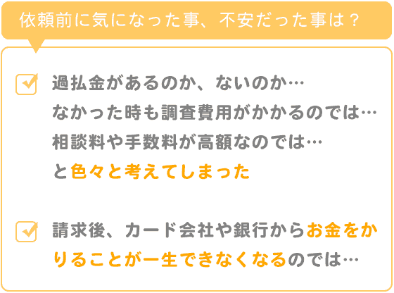 不安だったことは、過払金があるのか、ないのか、なかった場合に調査費用がかかるのではないかあったとしても、相談料や手数料を多く支払わなくてはいけないんじゃないかと色々と考えてしまっていました。