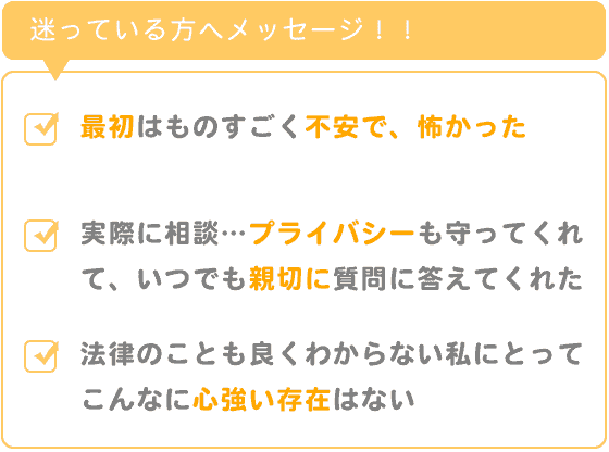 法律のことも良くわからない私にとってこんなに心強い存在はありませんでした。