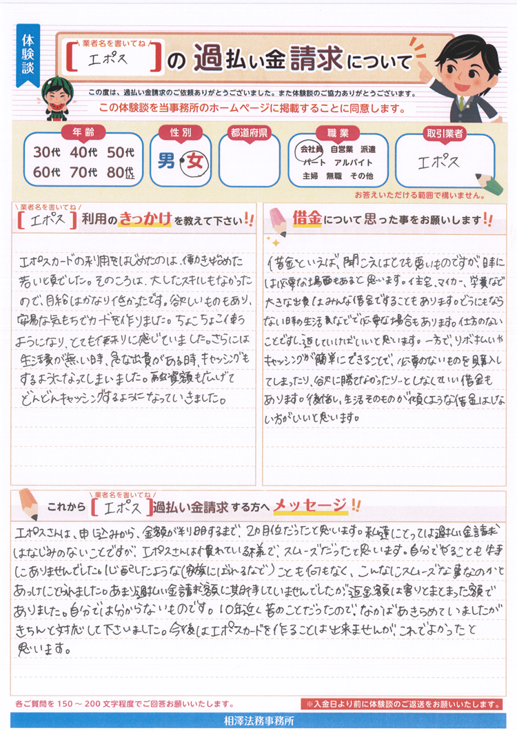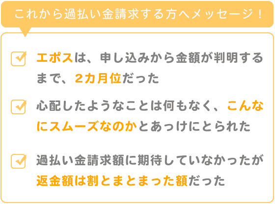 私たちにとっては過払い金請求はなじみのないことですが、エポスさんは慣れている様で、スムーズだったと思います。