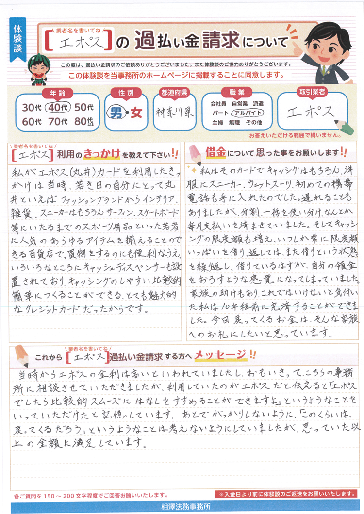 当時からエポスの金利は高いといわれていましたし、おもいきって、こちらの事務所に相談させていただきましたが、利用していたのがエポスだと伝えると「エポスでしたら比較的スムーズにはなしをすすめることができますよ」というようなことをいっていただけたと記憶しています。