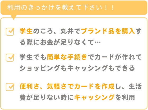 学生でも簡単な手続きでカードが作れる点や丸井でのショッピングだけではなく、困ったときのキャッシングもできて、丸井のATMや窓口でまとめて返済もできるという便利さ、気軽さでカードを作成し、生活費が足りない時にキャッシングを利用しました。