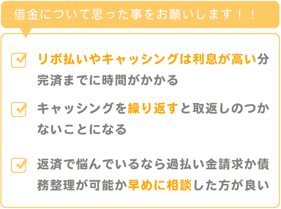 特に、リボ払いやキャッシングは利息が高い分、完済までに時間がかかり、さらにキャッシングを繰り返して取返しのつかないことになるため、「カード利用は計画的に」行うべきだと思います。