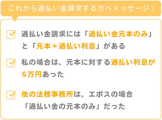 ちなみに、相澤さん以外の法務事務所に相談した際は、エポスの場合は「過払い金の元本のみ」の請求になり、それ以上を請求する場合は裁判になると説明を受けましたが、相澤さんから過払い利息も請求可能と教えてもらえたため、5万円お得でした。
