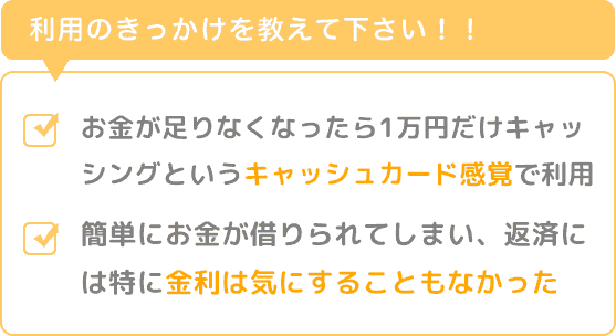 初めて持ったカードだったのでキャッシング等の認識が甘くよくわからないまま、財布のお金が足りなくなったら1万円だけキャッシングするというキャッシュカード感覚で利用していました。