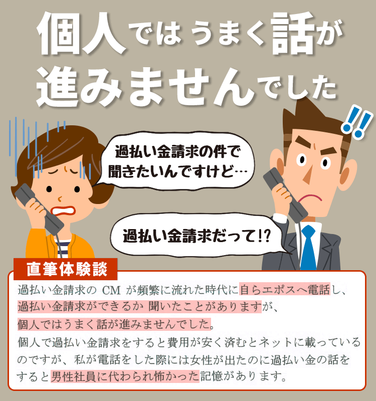 個人で過払い金請求をすると費用が安く済むとネットに載っているのですが、私が電話をした際には女性が出たのに過払い金の話をすると男性社員に代わられ怖かった記憶があります。