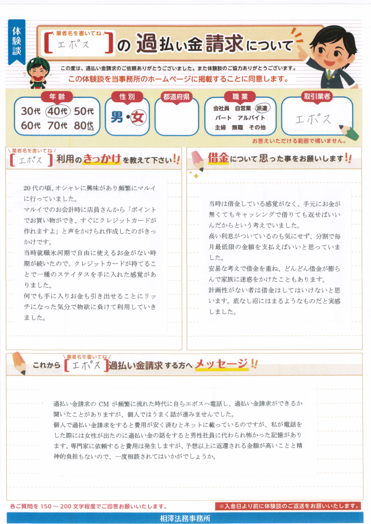 過払い金請求のCMが頻繁に流れた時代に自らエポスへ電話し、過払い金請求ができるか聞いたことがありますが、個人ではうまく話が進みませんでした。