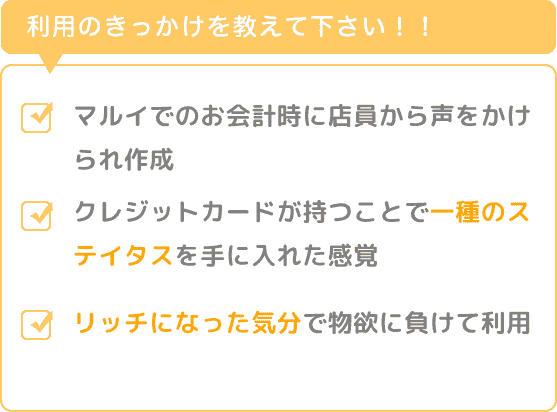 マルイでのお会計時に店員さんから 「ポイントでお買い物ができ、すぐにクレジットカードが作れますよ」 と声をかけられ作成したのきっかけです。