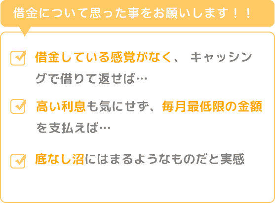 当時は借金している感覚がなく、 手元にお金が無くてもキャッシングで借りても返せばいいんだからという考えでいました。