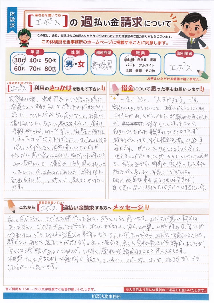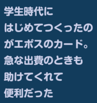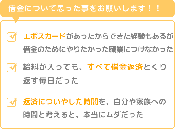欲しいもの、やりたいこと、お金にかえられないもの、エポスがあったからできた経験もありましたが、借金をしてしまったことで、自分のやりたかった職業につくこともできず、給料が入っても、すべて借金返済とくり返す毎日です。